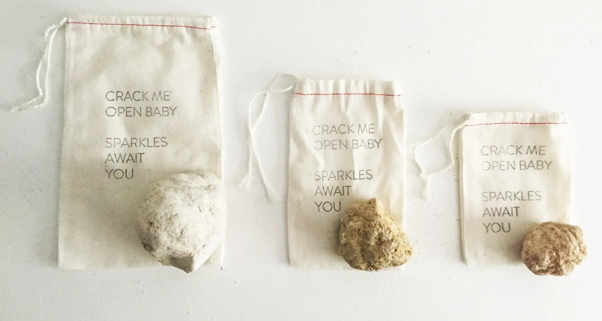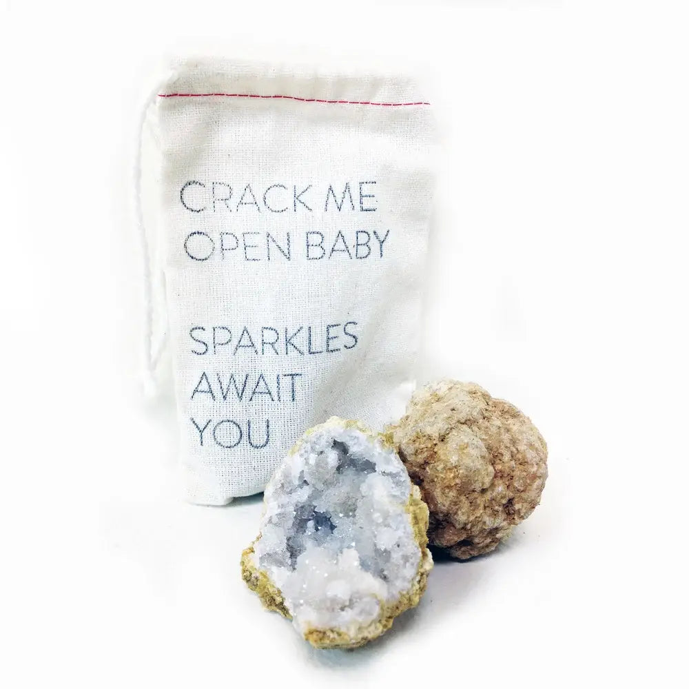 Inside of each drawstring pouch is a rock. Crack the rock open with a hammer and the interior will reveal a geode crystal interior! This is a super fun and interactive gift - great for children and adults alike! INSTRUCTIONS - Safety first. Please be aware of your surroundings and select a non precious surface to break open your geode - Use a heavy duty standard hammer - One strong hit is better than soft knocks - Enjoy the surprise - every geode is unique! MATERIALS 100% Cotton drawstring pouch hand stamped with the words: CRACK ME OPEN BABY SPARKLES AWAIT YOU Included in each bag is a geode rock.
